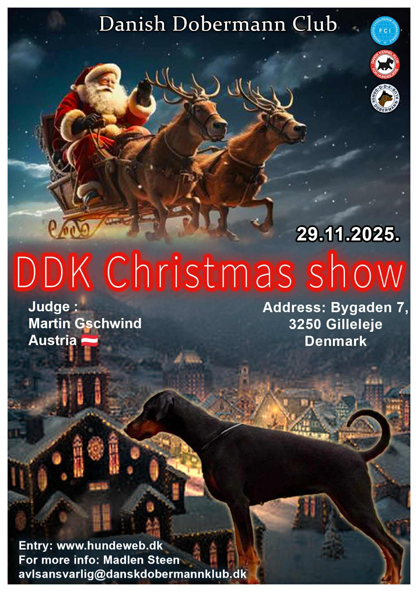 Læs mere: Juleudstilling-Gr. GribskovDommerMartin Gschwindl (A) Yderligere informationSkriv til Madlen Steen på avlsansvarlig@danskdobermannklub.dk TilmeldingTilmelding…